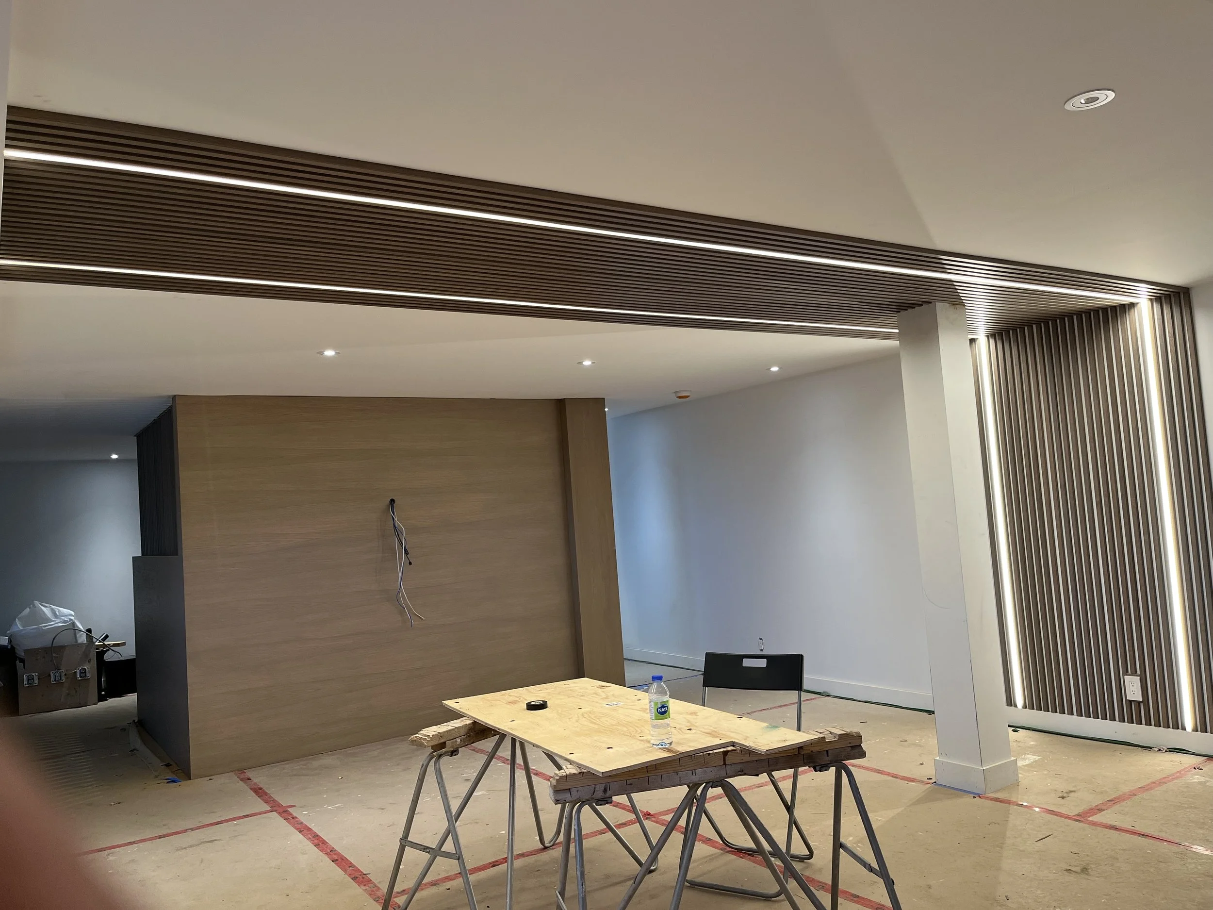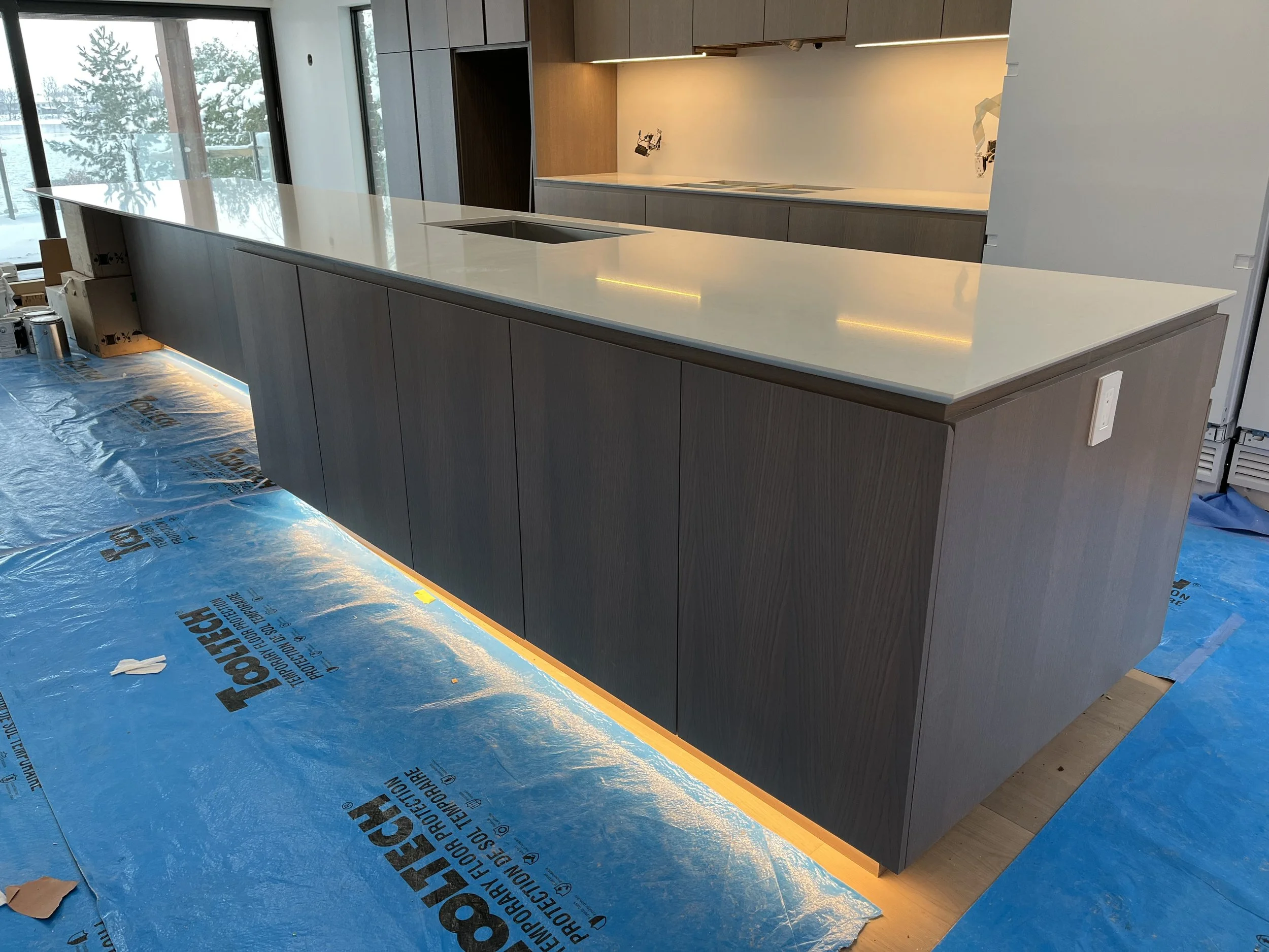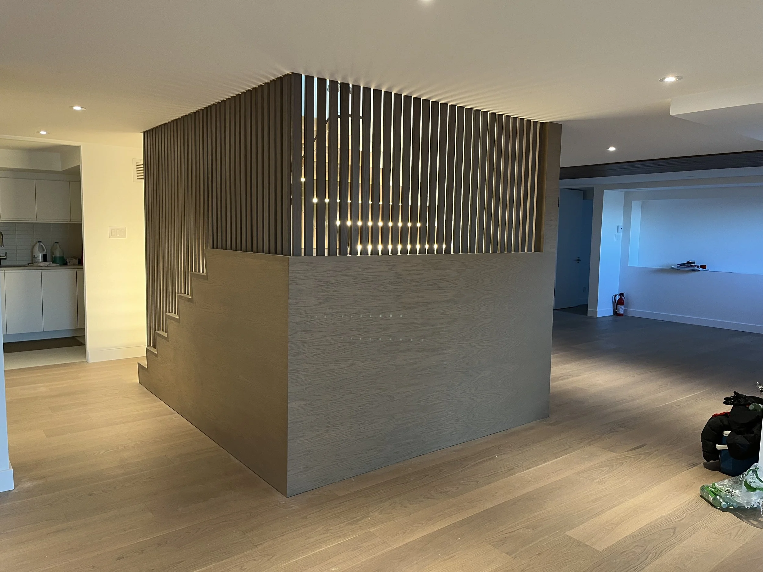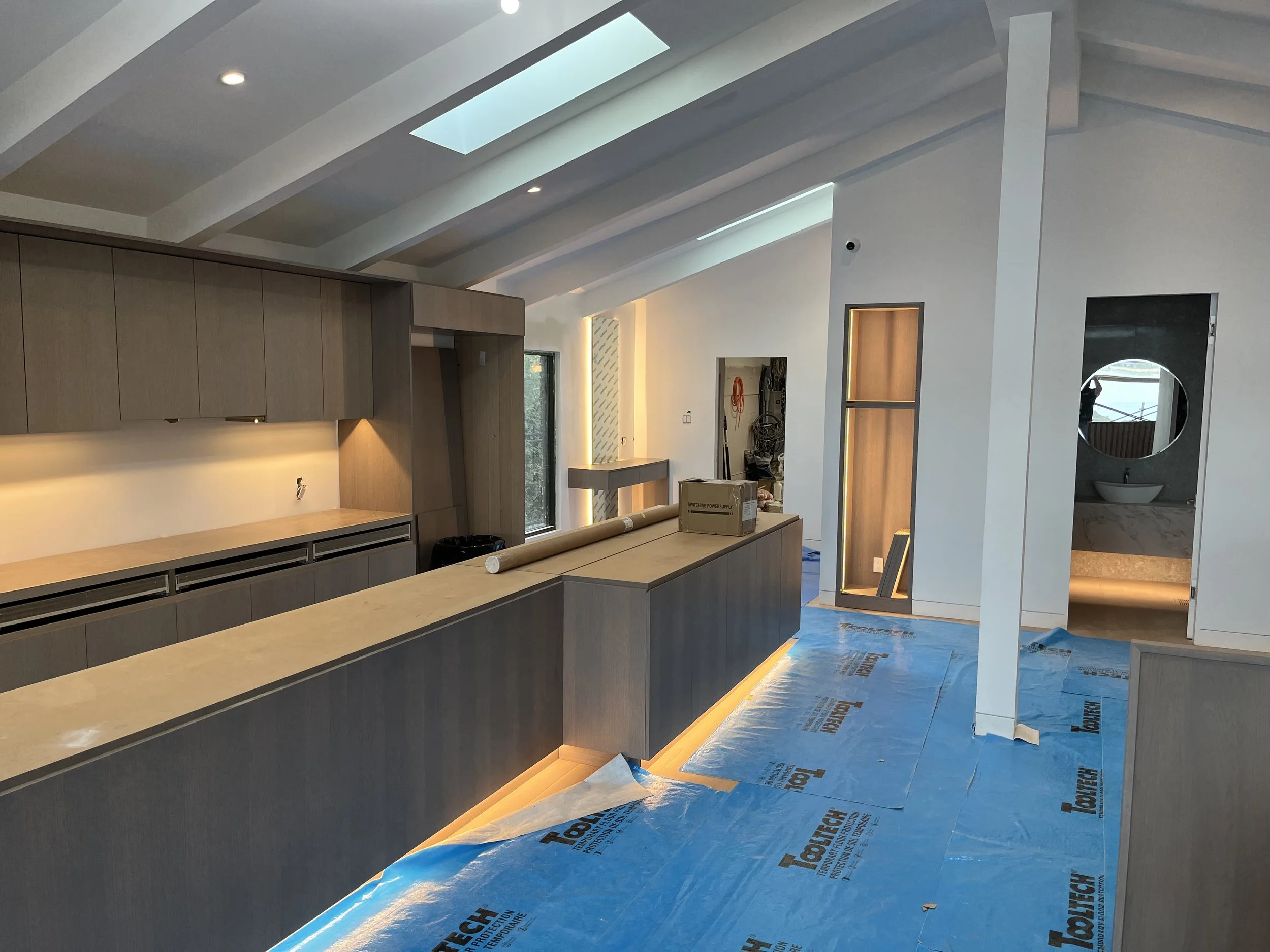 Projet rue saraguay Rénovation complète à pierrefonds d’une maison de 4000 pi.ca. de style californienne avec des finitions architecturales très épurées, de l’éclairage intégré en abondance et une vue spectaculaire sur la rivière des prairies.